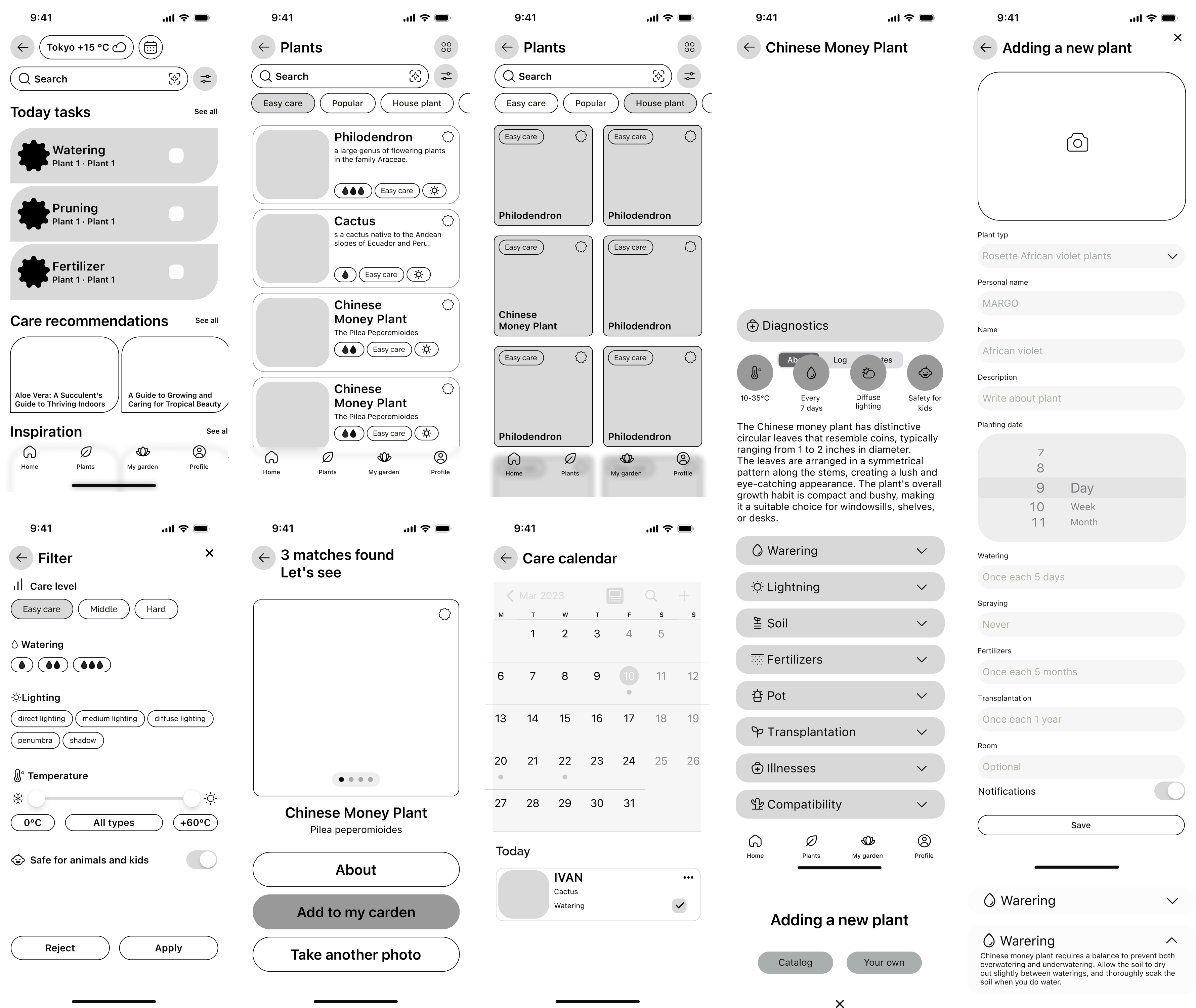 Created mid-fidelity wireframes to visualize the app’s core flows, including plant tracking, care reminders, and plant identification. Early wireframes were tested with users to identify friction points and refine navigation, ensuring a smooth and intuitive experience before moving to high-fidelity design.”